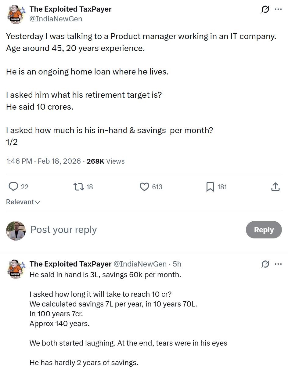 Because the numbers showed something he’d been avoiding for years: at his current savings rate, he’d reach ₹10 crore in approximately 140 years.